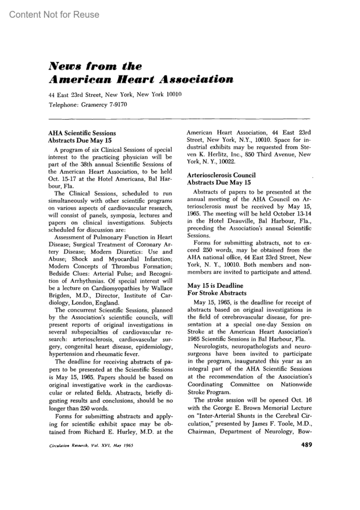 News from the American Heart AssociationCirculation Research 16(5):p 489-491, May 1965.Copyright © 1965 American Heart Association, Inc.