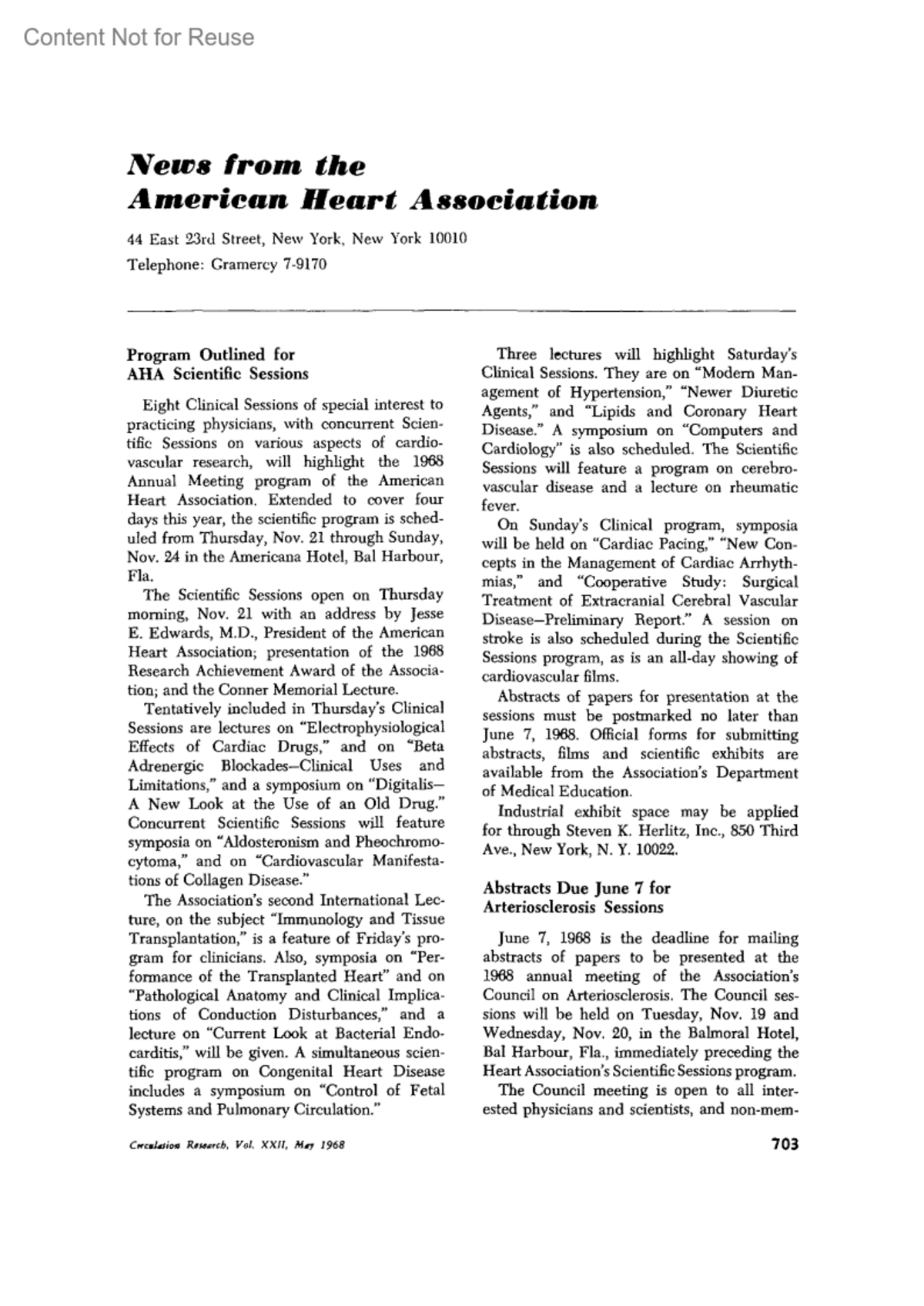 News from the American Heart AssociationCirculation Research 22(5):p 703-705, May 1968.Copyright © 1968 American Heart Association, Inc.