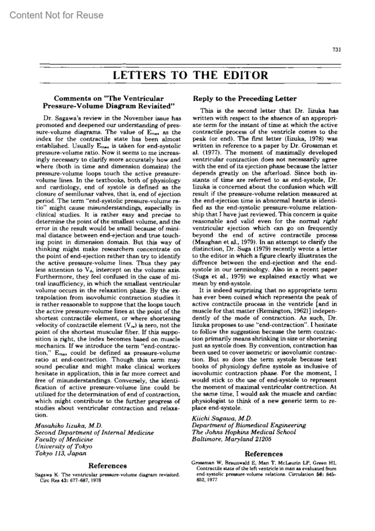 The Ventricular Pressure-Volume Diagram RevisitedSagawa, Kiichi M.D.Author informationDepartment of Biomedical Engineering The Johns Hopkins Medical School Baltimore, Maryland 21205Circulation Research 44(5):p 731-732, May 1979.Copyright © 1979 American Heart Association, Inc.