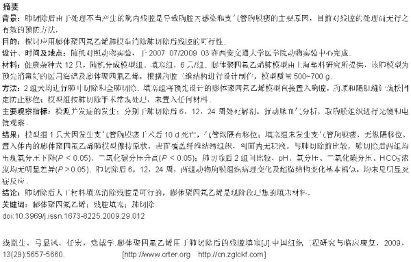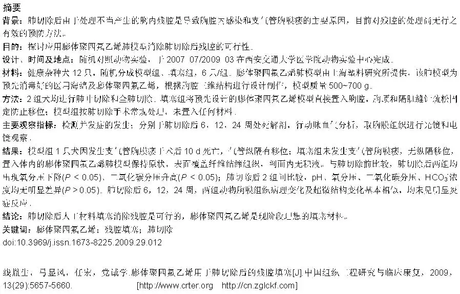 Xian YS, Gong XF, Ren H, Dang CX.Obliterating the residual space with polytetrafluoroethylene following pneumonectomy. Zhongguo Zuzhi Gongcheng Yanjiu yu Linchuang Kangfu. 2009;13(29):5657-5660. [http://www.crter.cnhttp://en.zglckf.com]
