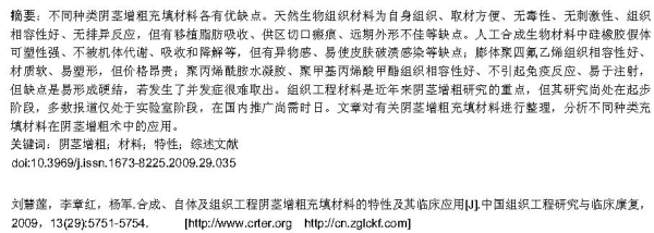 Liu HL, Li ZH, Yang J.Characteristics and clinical application of synthesized, autologous and tissue engineered penis thickening hydraulic filling materials.Zhongguo Zuzhi Gongcheng Yanjiu yu Linchuang Kangfu. 2009;13(29): 5751-5754. [http://www.crter.cnhttp://en.zglckf.com]