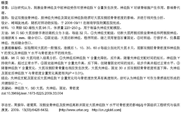 Li ZH, Zhou ZH, Xie JY. Effect of neuropeptide Y on bone mineral density after bilateral sciatic and femoral denervation and immobilization.Zhongguo Zuzhi Gongcheng Yanjiu yu Linchuang Kangfu. 2009;13(33): 6428-6432. [http://http://www.crter.cn http://en.zglckf.com]