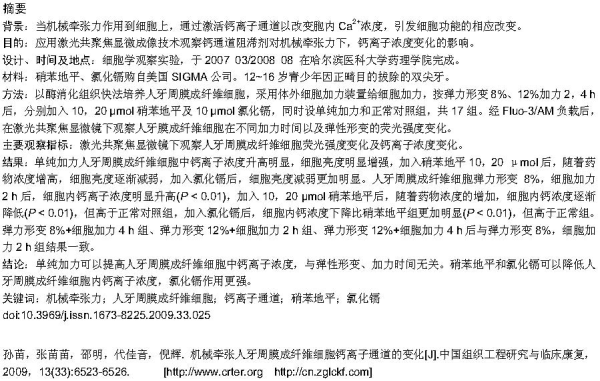 Sun M, Zhang MM, Shao M, Dai JY, Ni H. Changes in calcium ion channel of human periodontal fibroblasts under mechanical strain.Zhongguo Zuzhi Gongcheng Yanjiu yu Linchuang Kangfu. 2009;13(33): 6523-6526. [http://http://www.crter.cn http://en.zglckf.com]