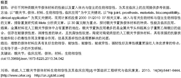 Using “hip joint, prosthesis, materials, biocompatibility, clinical application” in Chinese and in English as the key words, a computer retrieval was performed for articles published between January 2000 and July 2010. Articles related to the biocompatibility of biological materials to the host were included, duplicated research or Meta analysis were excluded. Totally 30 articles focused on the type, performance and clinical application of hip replacement prosthesis materials.
