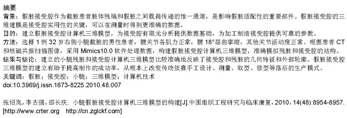 One male patient, 32 years old, undergoing below knee amputation, was selected, with normal hip muscle strength, 18° flexion contracture, and normal other joint activity. According to CT and MRI, data were processed using the Mimics10.0 software to construct three-dimensional model of the prosthetic socket and accurately simulate the residual limb and prosthetic socket structure.