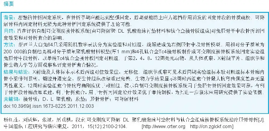 Yang HS, Liu YH, Zhang B, Tu CQ, Duan H.Changeable rigidity degradable poly-lactic-acid gasket combined with titanium alloy for treatment of tibia fracture. Zhongguo Zuzhi Gongcheng Yanjiu yu Linchuang Kangfu. 2011;15(12): 2100-2104.