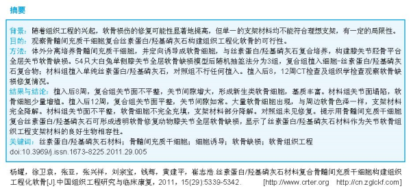 With the emergence of tissue engineering, the possibility of repairing the cartilage injury is greatly increased, but single scaffold materials fail to meet ideal scaffold, and have some limitations.