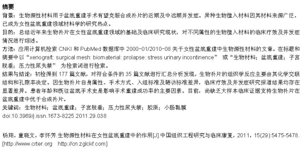 A comprehensive retrieval of CNKI and Pubmed search from January 2000 to August 2010 was undertaken using the key words of “xenograft, surgical mesh, biomaterial, prolapse, stress urinary incontinence” in English and “biomaterial; pelvic reconstruction; prolapse; stress urinary incontinence” in Chinese.
