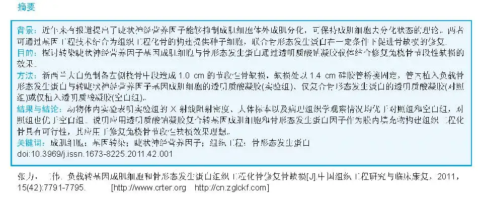 Zhang L, Wang W. Bone defect repair with a new tissue-engineered bone carrying bone morphogenetic protein and transgene myoblasts in rabbits. Zhongguo Zuzhi Gongcheng Yanjiu yu Linchuang Kangfu. 2011;15(42): 7791-7795. [http://www.crter.cnhttp://en.zglckf.com]