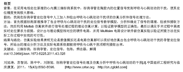It showed that either numerical simulation or circuit simulation could emulate catheter positioning signals with respiration and heartbeat interference, the theoretical analysis method and actual circuit system could extract the respira-tion and heartbeat interference terms successfully.