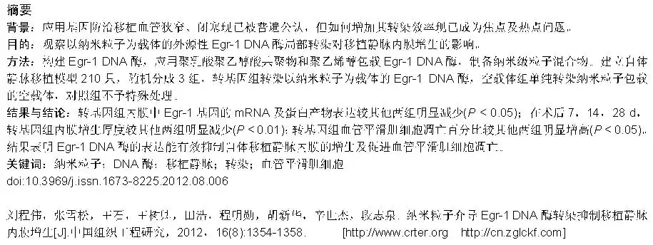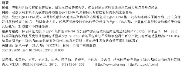 Liu CW, Zhang XS, Wang S, Wang SQ, Tian H, Cheng MX, Hu XH, Xin SJ, Duan ZQ. Transfection of early growth response gene-1 DNA enzyme mediated by nanoparticles inhibits vein graft intimal hyperplasia. Zhongguo Zuzhi Gongcheng Yanjiu. 2012;16(8): 1354-1358. [http://www.crter.cnhttp://en.zglckf.com]