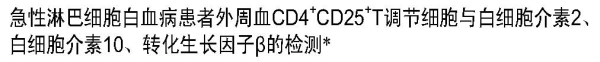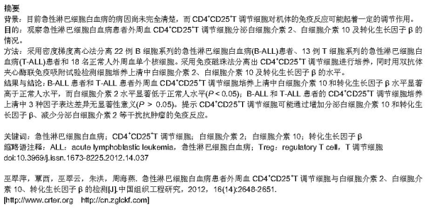 Wu CP, Qin X, Wu CY, Zhu H, Zhou HY. Detection of interleukin 2, interleukin 10, transforming growth factor β and CD4+CD25+ regulatory T cells in peripheral blood of patients with acute lymphoblastic leukemia.Zhongguo Zuzhi Gongcheng Yanjiu. 2012;16(14): 2648-2651. [http://www.crter.cnhttp://en.zglckf.com]