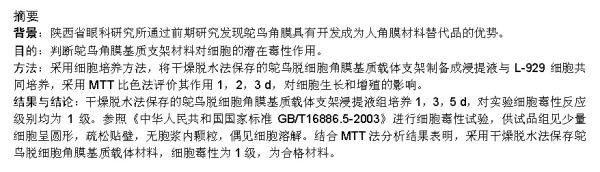 Cell culture methods were used to culture L-929 cells in the extracts of ostrich acellular corneal stroma which was dried and dehydrated. 3-(4,5)-Dimethylthiahiazo(-z-y1)-3,5-di-phenytetrazoliumromide assay was used to evaluate the growth and proliferation of cells after cultured for 1, 2 and 3 days.