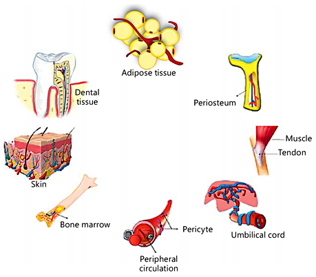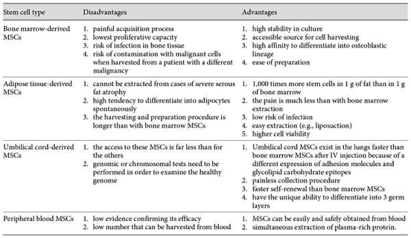 MSCs are multipotent stromal cells present in most adult connective tissues. They have been extensively studied because of their ability to differentiate into multiple cell types [Eslaminejad and Nadri, 2009; Eslaminejad et al., 2009]. Friedenstein et al. [1970] demonstrated a rare population of plastic-adherent cells in bone marrow (approx. 1 in 10,000 nucleated cells) that were able to form a spindle-shaped cell morphology and round-shaped colonies. These cell clones expanded into round-shaped fibroblastoid colonies, which are termed colony-forming unit-fibroblasts, or CFU-Fs. Some of the colonies could differentiate into bone, cartilage, or adipose tissue [Bianco et al., 2008]. Other research groups extended these initial observations through the study of the proliferative abilities and phenotypic characteristics of CFU-Fs [Caplan and Bruder, 2001; Eslaminejad and Taghiyar, 2010; Eslaminejad et al., 2011; Lotfy et al., 2014; Baker et al., 2015]. MSCs have been widely used in stem cell transplantation, tissue engineering, gene therapy, and immunotherapy [Reiser et al., 2005; Marion and Mao, 2006; Zhao et al., 2016]. These cells express CD105, CD73, and CD90, and are not able to express CD45, CD34, CD14, or CD11b, CD79α or CD19 antigens. In addition, they are able to differentiate into at least 3 cell lineages in vitro, including chondroblasts, osteoblasts, and adipocytes [Eslaminejad et al., 2007; Wyse et al., 2014]. MSCs can migrate to defect sites and facilitate bone regeneration, but the fundamental mechanisms in this process remain unclear. In regenerative medicine, among all types of stem cells, MSCs are the most commonly used stem cells because of their beneficial properties [Murphy et al., 2013]. The advantages and disadvantages of different types of MSCs are listed in Table 1. MSC populations and maintenance of their homeostasis are established in MSC niches [Ehninger and Trumpp, 2011]. Niches are specific anatomic locations that regulate tissue generation, maintenance, and repair by MSCs [Glenn and Whartenby, 2014]. The niche has a dual role by which it saves MSCs from depletion and also protects the host from overexuberant MSC proliferation. In fact, it controls the balanced response of MSCs to the necessary requirements of the body [Glenn and Whartenby, 2014]. It may also preclude aberrant function on MSCs or other targets that cause malfunctions. MSC niches are located adjacent to vessel walls, on the endosteal surfaces of trabecular bone, umbilical cord blood (vein, arteries, Wharton jelly, and lining membrane) [Lee et al., 2004], dental tissues (dental pulp, exfoliated deciduous teeth, periodontal ligament, apical papilla, dental follicle, and periapical cyst-MSCs [Kim et al., 2011; Marrelli et al., 2015b], adipose tissue [Zuk et al., 2002], and synovium (synovial membrane and fluid) [Jones et al., 2004]. The sources of MSCs are shown in Figure 1.