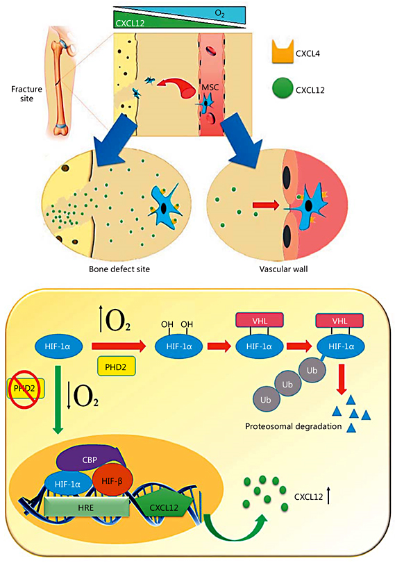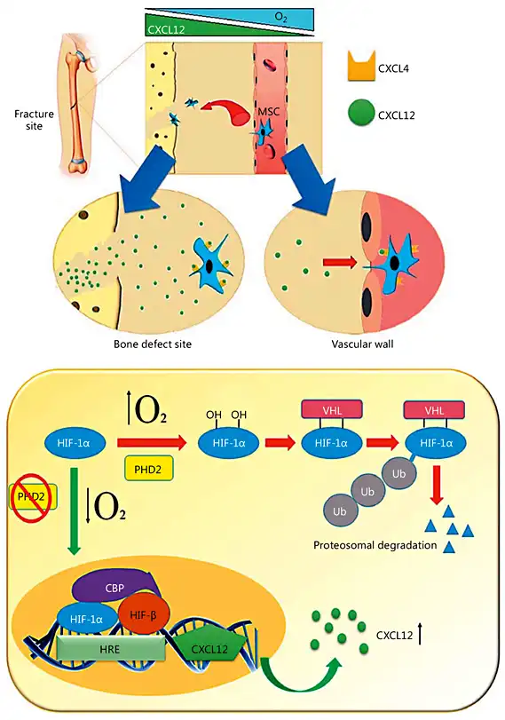 MSC homing to the fracture site. HIF-1α may increase the transcription of CXCL12 (SDF1) production in the cells of damaged bone. In normoxia conditions, HIF-1α is hydroxylated by the activity of prolyl hydroxylase domain protein 2 (PHD2), leading to HIF-1α binding to the von Hippel-Lindau protein (VHL) and subsequent ubiquitination (Ub) and proteasomal degradation. Otherwise, in hypoxia (low O2), due to a reduction of PHD2 activity, HIF-1α levels are stabilized and migrate into the nucleus to form a complex with HIF-1β. HIF-1α then binds to the hypoxia-responsive element (HRE) on the promoter of the CXCL12 gene with the cooperation of the transcriptional coactivating CREB-binding protein (CBP). This cascade can drive the upregulation of CXCL12 levels at the site of injury and promotes the migration of MSCs from the blood circulation to the defect site. The CXCL12 ligand binds to its receptor CXCR4 on circulating cells and converts cell surface integrins to a high-affinity state. This process is necessary for the binding of MSCs to vascular endothelial cells. MSCs then migrate through the endothelium towards the CXCL12 gradient. This process of chemokine-mediated cell extravasation is very similar to leukocyte transmigration.