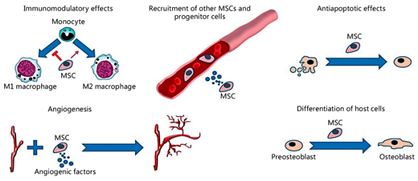 Some mechanisms of MSC action on bone reconstruction and repair. The beneficial effects of MSCs include immunomodulatory effects, stimulation of angiogenesis, antiapoptotic effects in osteoblastic lineage cells, recruitment of host MSCs/progenitor cells, and stimulation of their differentiation into osteoblasts.