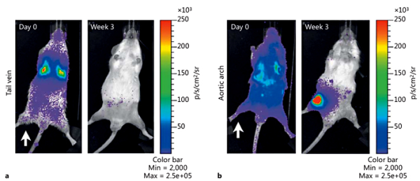 Bioluminescence imaging of the IV and IA route of cell delivery in rats. Rats were irradiated unilaterally (white arrow) before IV (a) or IA (b) injection with 1 × 106 BMC9 MSCs expressing a luciferase reporter [Kean et al., 2013]. Copyright© 2013 Thomas J. Kean et al. This is an open access article distributed under the Creative Commons Attribution License, which permits unrestricted use, distribution, and reproduction in any medium, provided the original work is properly cited.
