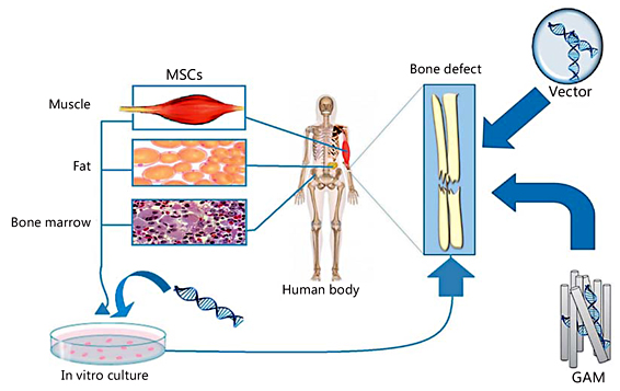 The osteogenic genes can also be transduced to MSCs using a gene-activated matrix (GAM). GAM is one of the tissue engineering approaches that consists of collagenous scaffold impregnated with plasmid DNA encoding osteogenic genes. When GAM is inserted into a bone defect, host MSCs entering the scaffold are transfected by plasmid and consequently secrete the osteogenic gene product. The usefulness of GAM in bone tissue regeneration was investigated by Umebayashi et al. [2015]. GAM with atelocollagen containing cDNA of BMP4 (pBMP4) or Runx2 (pRunx2) was transplanted into the cranial bone surface under the periosteum of F344 rats. At 2, 4, and 8 weeks after surgery, the results showed that the bone induction effect of GAM is dose-dependent and bone formation was detectable in specimens containing 1 mg of pBMP4 or pRunx2 at 8 weeks.