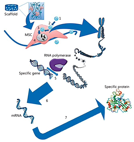 The gene delivery process for MSCs: (1) the carrier or nanoparticle is complexed with the target gene; (2) the carrier or nanoparticle is endocytosed to travel through the intracellular pathway; (3) the target gene enters the nucleus; (4) the target gene resides in the nucleus; (5) the RNA polymerase transcript target gene along with the cellular gene; (6) mRNA transcription of the target gene; and (7) mRNA translation into a specific osteogenic protein.