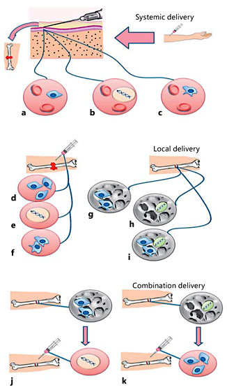 MSC delivery approaches. Systemic delivery of MSCs (a), osteoinductive genes (b), and gene-modified MSCs (c) by injection into the circulatory system. Local delivery of MSCs with or without culture media (d), osteoinductive genes (e), and gene-modified MSCs with or without growth factors (f) by direct injection at the fracture site. Local delivery of MSCs (g), osteoinductive genes (h), and MSCs with osteoinductive genes (i) by incorporation in scaffolds, which are implanted at the fracture site. Combination therapy: MSCs are implanted with scaffolds in the fracture site and osteoinductive genes are injected locally at the site of implantation 1-2 weeks later (j). By an alternative method, osteoinductive genes with scaffolds can be implanted in the fracture site and MSCs injected locally at the site of implantation 1-2 weeks later (k).
