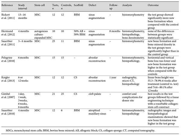 In recent decades, the application of the MSCs for treating oral and craniofacial bone defects has become more and more popular in the literature. To list a few, MSCs have been incorporated with hydroxyapatite/TCP scaffolds for the reconstruction of calvarial and alveolar bone in mice and dogs [De Kok et al., 2003; Mankani et al., 2006], seeded into microporous gelatin scaffold for the regeneration of calvarial defects in mice [Krebsbach et al., 1998], combined with PLA-based scaffolds to repair cranial bone defects in rabbits [Bidic et al., 2003], and loaded on hyaluronan-based scaffold in order to regenerate orbital rim defects in pigs [Radice et al., 2000]. MSCs with or without scaffold and osteogenic factors have been used for many sinus augmentation surgeries in many clinical trials [Gimbel et al., 2007; Pelegrine et al., 2010; Sauerbier et al., 2010; Rickert et al., 2011; Sauerbier et al., 2011; Hermund et al., 2012; Kaigler et al., 2013]. In addition, MSCs have been used by different delivery approaches in other craniofacial defects caused by traumatic bone defect, osteomyelitis, and tumor resection (Table 2). Most clinical trials in oral and craniofacial bone repair have reported promising results [Gimbel et al., 2007; Pelegrine et al., 2010; Sauerbier et al., 2010; Rickert et al., 2011; Sauerbier et al., 2011; Kaigler et al., 2013]; however, no statistically significant results were found in one clinical trial [Hermund et al., 2012]. Such controversial results may be rooted in the various technical errors. For example, the autogenous bone MSCs were harvested from the atrophic tuberosity region that may contain low-quality MSCs for regeneration purposes. The conventional MSC cultivation and expansion procedure may have reduced the efficacy of regenerative effects. Such reduced efficacy occurs especially when other clinical trials apply BMACs directly and without any expansion process, or when the procedure is carried out without special bioreactors or high-tech facilities. Furthermore, the results of some studies that did not show proper bone formation may be due to low-quality starting material or inadequate culture conditions. The culture conditions used are vastly different from one laboratory to another, and this can have a dramatic impact on outcome.