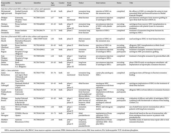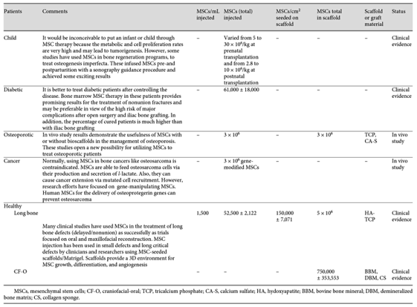 The challenge for the upcoming decade of bone regeneration research is therefore to build on recent advances in our understanding of stem cells and our improved understanding of cellular and molecular therapeutic mechanisms of action in long bone delayed union/nonunion fractures. However, there is a significant clinical need to illustrate the exact mechanisms of MSCs in bone healing processes and evaluate their performance on large bone defects, delay/nonunion fractures, and oral bone regeneration. This is very important in order to obtain a detailed practical and comprehensive approach with maximum beneficial effect because an inappropriate or false approach can be disastrous. For instance, differentiation disorders in MSCs may lead to tumorigenesis or their differentiation into unwanted adult cells (such as the differentiation of MSCs into osteoblasts in cardiac implantation) [Meier et al., 2013]. To overcome these drawbacks, new technologies and a novel observation system that controls the growth condition under standardized protocols needs to be developed. In recent years, many efforts have been made and currently many clinical trials are being conducted to regenerate bone tissue using MSCs and other progenitor cells. While experimental and some clinical studies have shown beneficial effects of MSCs on bone healing, the exact mechanisms by which these cells improve bone regeneration remain unclear. Clinical applications of stem cells have been restricted by numerous factors, including: (1) ethical concerns; (2) the immunological rejection of cells from heterologous origins; (3) the limited amount of available stem cells for implantation at the injured site, requiring ex vivo expansion; (4) donor-related differences; (5) cost; (6) feasibility; (7) expertise; (8) aging; (9) translational difficulties; and (10) other factors [Hipp and Atala, 2004]. Moreover, the safety of these procedures has to be evaluated before clinical application. In many clinical and experimental studies different procedures have been used to treat bone injuries. However, to help achieve the most practical approach, some important issues are highlighted in Table 4.