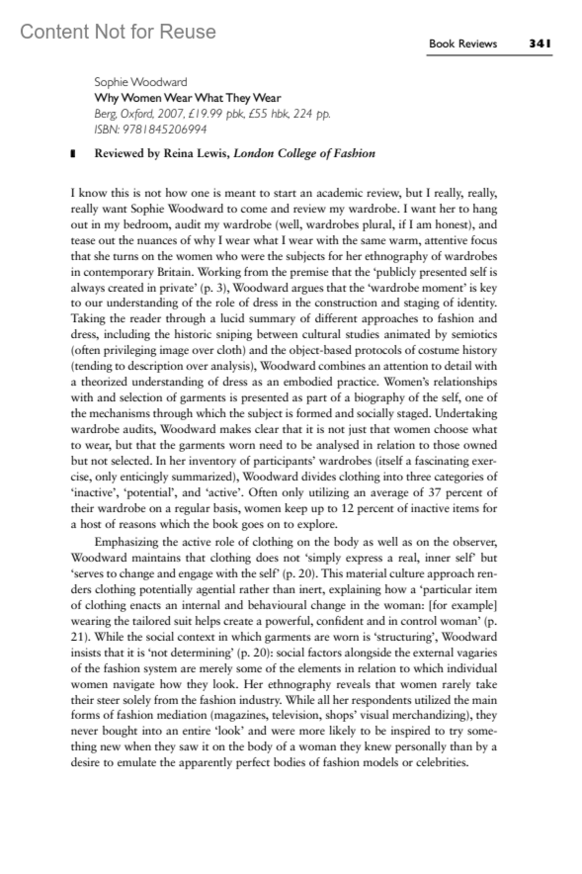 Sophie Woodward Why Women Wear What They Wear Berg, Oxford, 2007, £19.99 pbk, £55 hbk, 224 pp. ISBN 9781845206994