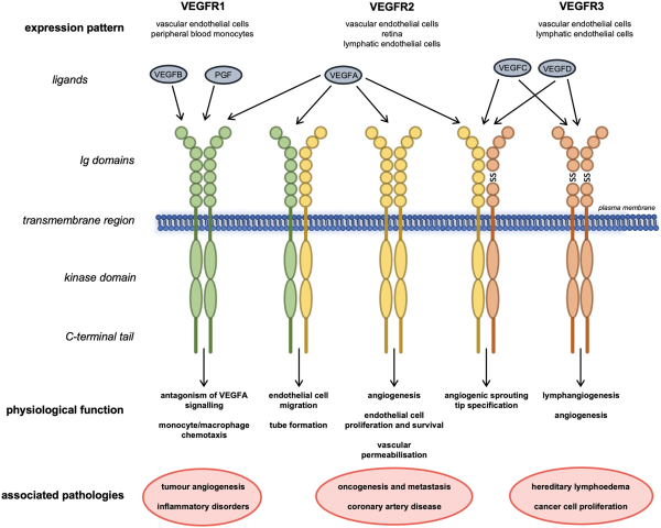 Structures, interactions, physiological roles, and associated diseases of VEGFR family members. Schematic showing the interactions of the three VEGFRs with each other and their ligands at the plasma membrane. Their expression pattern, physiological roles and pathologies associated with their levels or dysfunction are also shown. Ig, immunoglobulin-like domain; SS, disulphide bond.