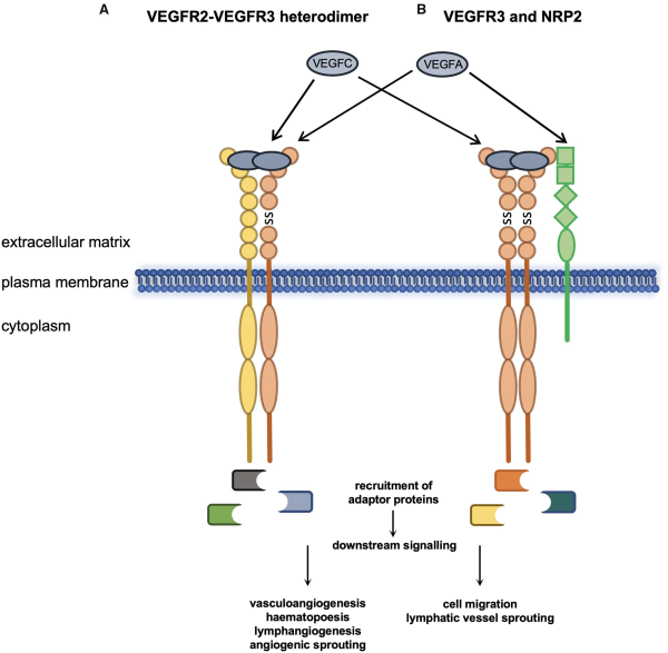 As mentioned previously, there is some evidence that dimerization of the VEGFRs can occur in the absence of ligand with reduced downstream signalling. However, it has been shown that both VEGFA and VEGFC strongly promote heterodimerization of VEGFR2 and VEGFR3 in both developing blood vessels and in early lymphatic progenitor cells., The presence of ligand also leads to spatial aggregation of dimers in the leading tip of growing angiogenic sprouts.,,