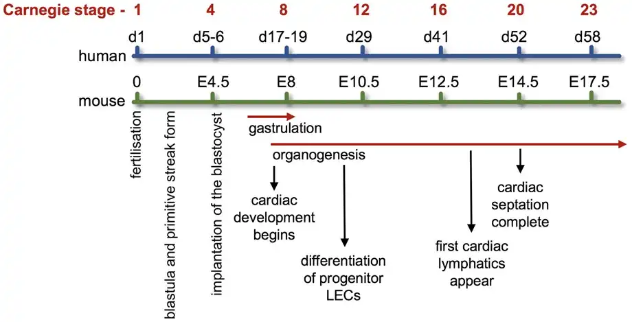The cardiovascular system develops early during embryogenesis shortly after gastrulation with the beginning of cardiogenesis. Figure 4 compares the developmental timings of both cardiovascular and lymphovascular systems following fertilization during human and mouse embryogenesis aligned with the established Carnegie stages of human embryonic development.