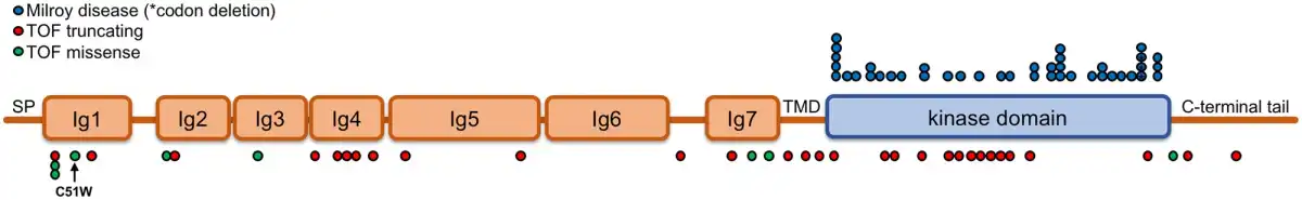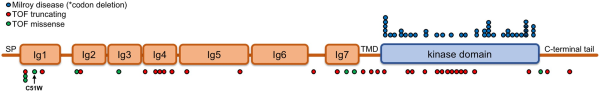 VEGFR3 was first implicated in Milroy disease when a region of chromosome five was linked to inherited lymphoedema cases and the FLT4 locus was chosen as the best candidate gene in this region for further investigation. A FLT4 missense mutation, p.H1035A, was identified in a Milroy patient and in vitro assessment of the mutation found that, compared to wild type protein, receptor trans-autophosphorylation was inhibited. Subsequently, further mutations in FLT4 have been identified and approximately seventy percent of Milroy cases have been given a molecular diagnosis. Importantly, the 57 reported FLT4 mutations identified in Milroy disease to date are either missense (n = 54) or small in frame deletions (n = 3) within the kinase domain coding region.