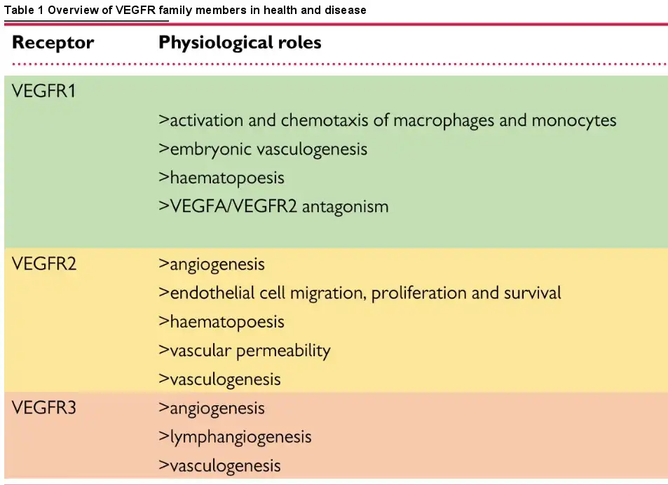 Homodimeric VEGFR2 is a key regulator of angiogenesis; endothelial cell proliferation and survival; and vascular permeability in response to the canonical VEGF ligand VEGFA. VEGFR1 has a key function antagonizing VEGFR2 signalling mediated by a greater binding affinity for VEGFA that allows for sequestration of the ligand. VEGFR1 demonstrates immunomodulatory functions, driving monocyte, and macrophage chemotaxis. VEGFR1/VEGFR2 heterodimers orchestrate endothelial cell migration and tube formation. VEGFR2 also cooperates with VEGFR3 during cell tip specification in angiogenic sprouting. VEGFA can also interact directly with the PDGF (platelet-derived growth factor) signalling pathway during mesenchymal cell proliferation and migration.,