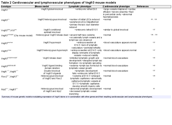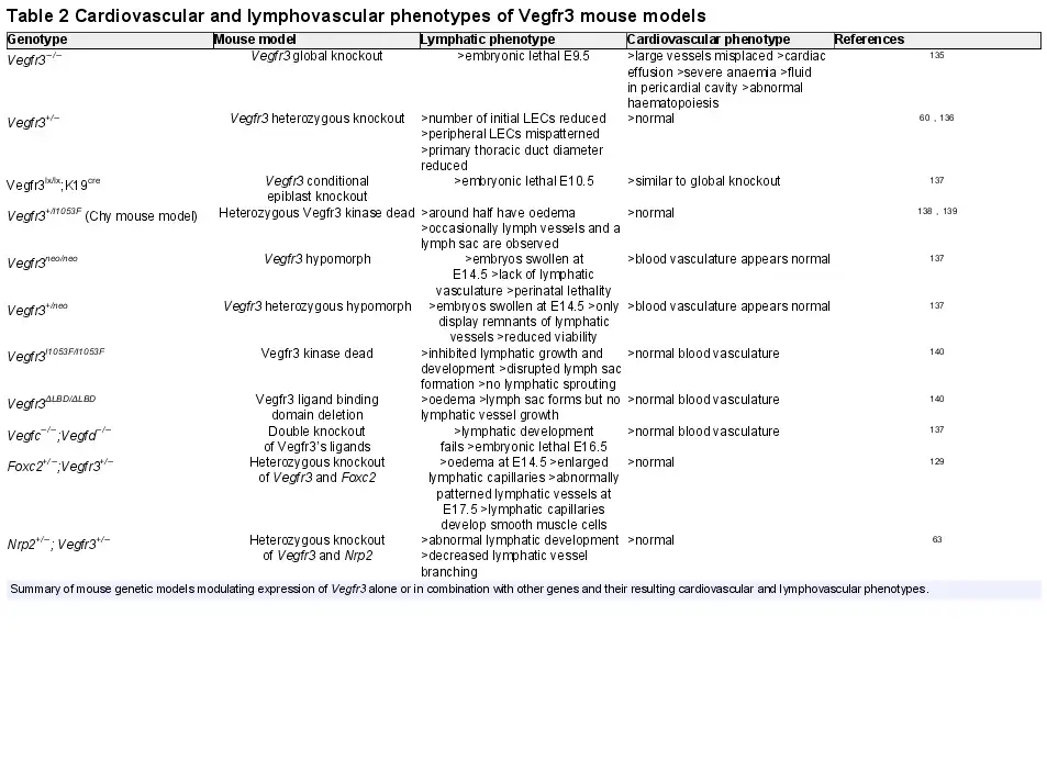 Double heterozygous models of Vegfr3 with either Nrp2 or Foxc2 have abnormal lymphatic system development but no embryonic lethality due to cardiovascular failure, further indicating that the function of Vegfr3 in heart development is distinct to that which mediates LEC maturation and lymphangiogenesis.,