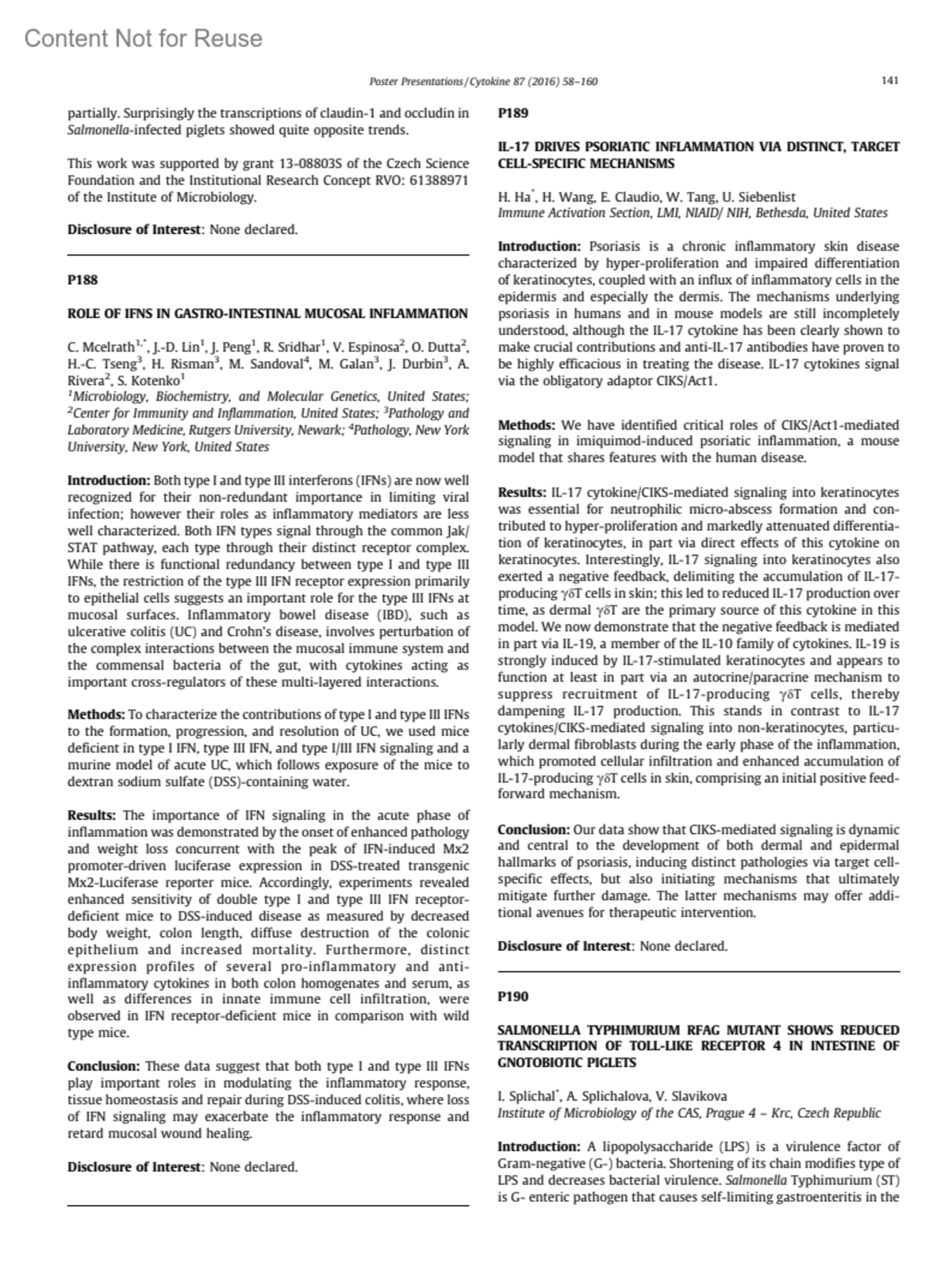 IL-17 DRIVES PSORIATIC INFLAMMATION VIA DISTINCT, TARGET CELL-SPECIFIC MECHANISMSP189Ha, H.Wang, H.Claudio, E.Tang, W.Siebenlist, U.Author informationImmune Activation Section, LMI, NIAID/ NIH, Bethesda, United StatesCytokine 87:p 141, November 2016.Copyright © 2016Elsevier, Inc.