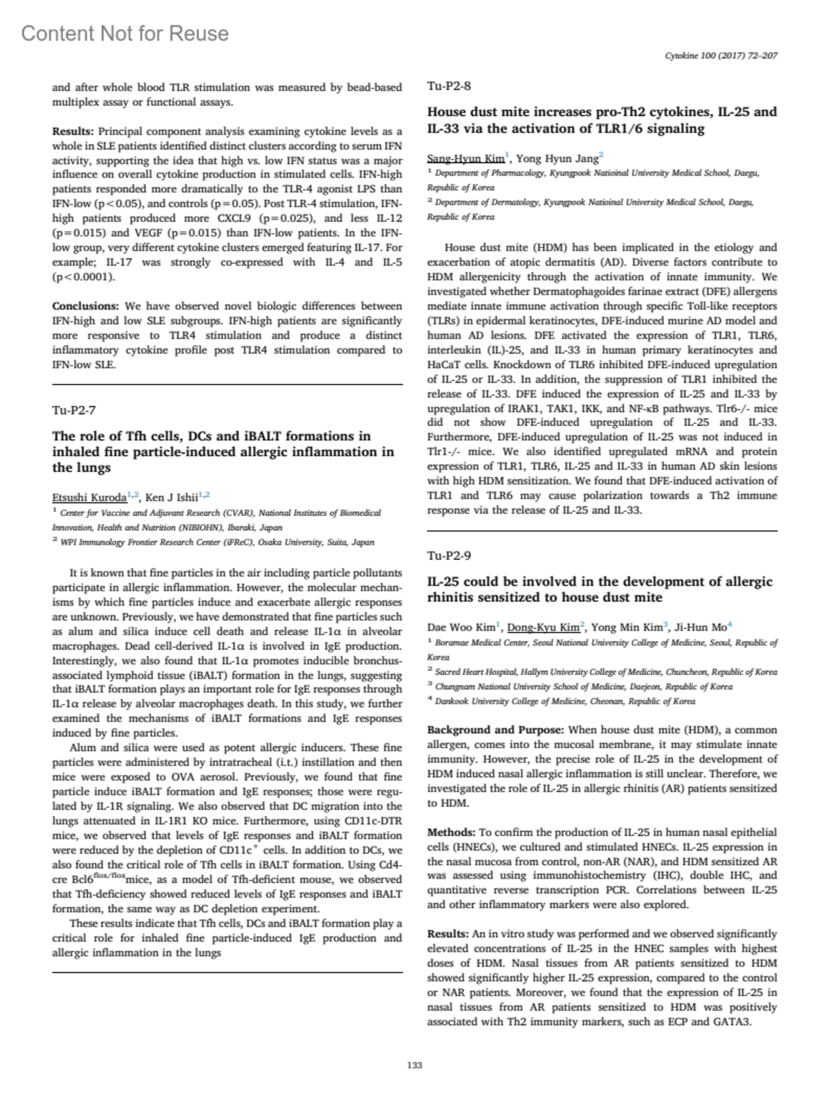 House dust mite increases pro-Th2 cytokines, IL-25 and IL-33 via the activation of TLR1/6 signalingTu-P2-8Kim, Sang-HyunJang, Yong HyunAuthor information1Department of Pharmacology, Kyungpook Natioinal University Medical School, Daegu, Republic of Korea2Department of Dermatology, Kyungpook Natioinal University Medical School, Daegu, Republic of KoreaCytokine 100:p 133, December 2017.Copyright © 2017Elsevier, Inc.