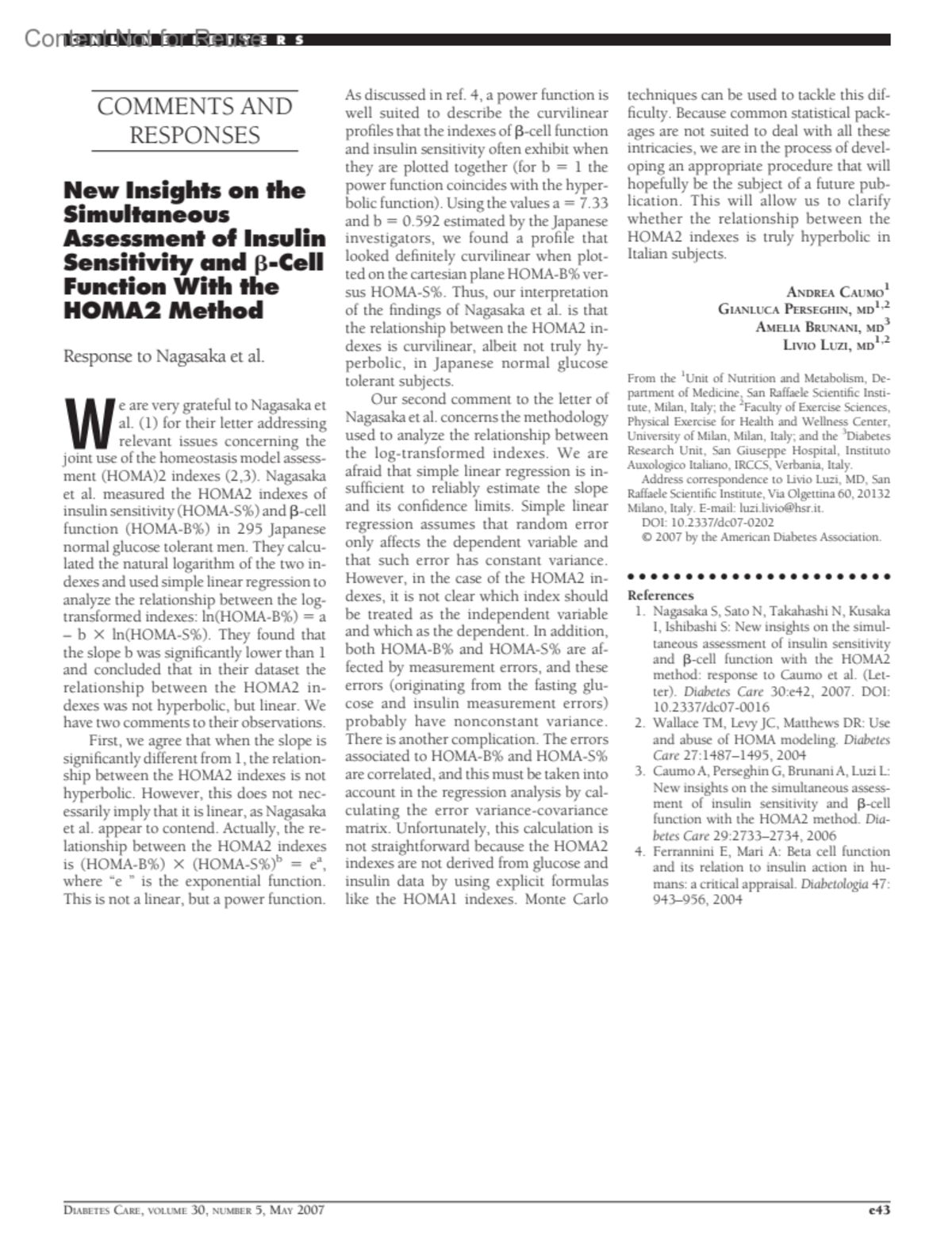 New Insights on the Simultaneous Assessment of Insulin Sensitivity and β-Cell Function With the HOMA2 Method