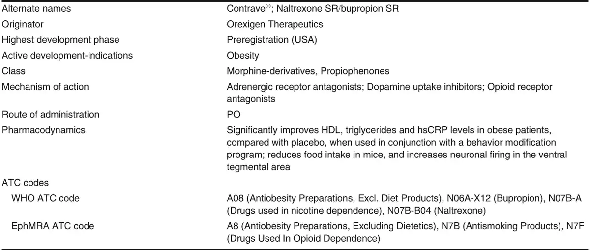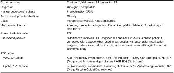 Orexigen® Therapeutics is developing a proprietary fixed-dose combination of naltrexone sustained release (SR) and bupropion SR in a single tri-layer tablet, for the treatment of obesity. The tablet contains naltrexone SR 32 mg and bupropion SR 360 mg. The product it is awaiting approval in the US. In addition, the combination has been tested in an open-label phase II study for smoking withdrawal in overweight or obese subjects.