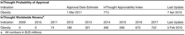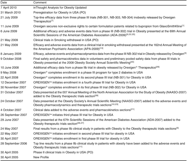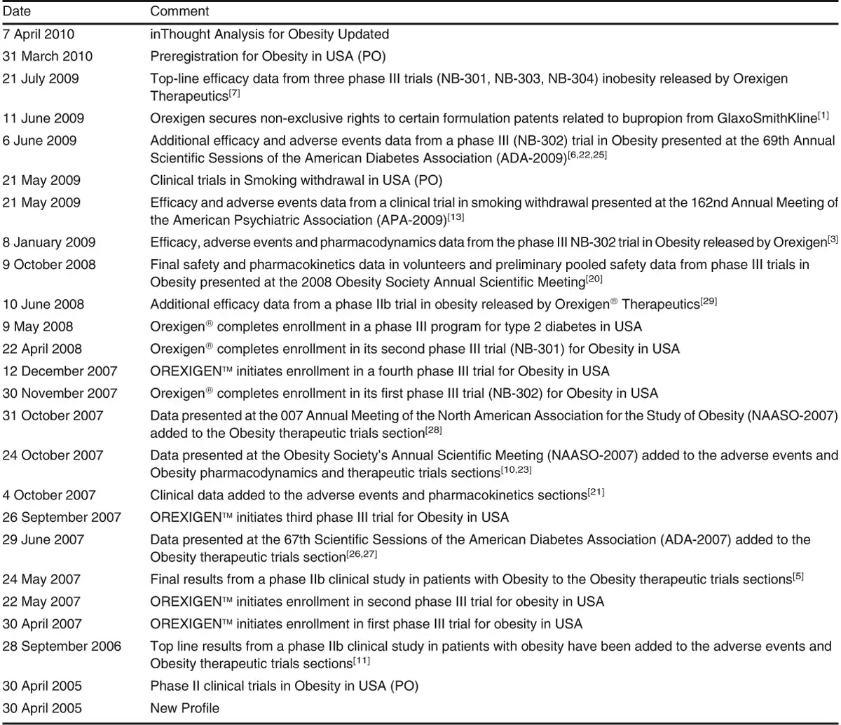 In March 2010, Orexigen submitted an NDA for approval of naltrexone SR/bupropion SR (Contrave®) for the treatment of obesity in the US. The new drug application (NDA) comprises data from the Contrave Obesity Research (COR) clinical program in more than 4500 patients.[]