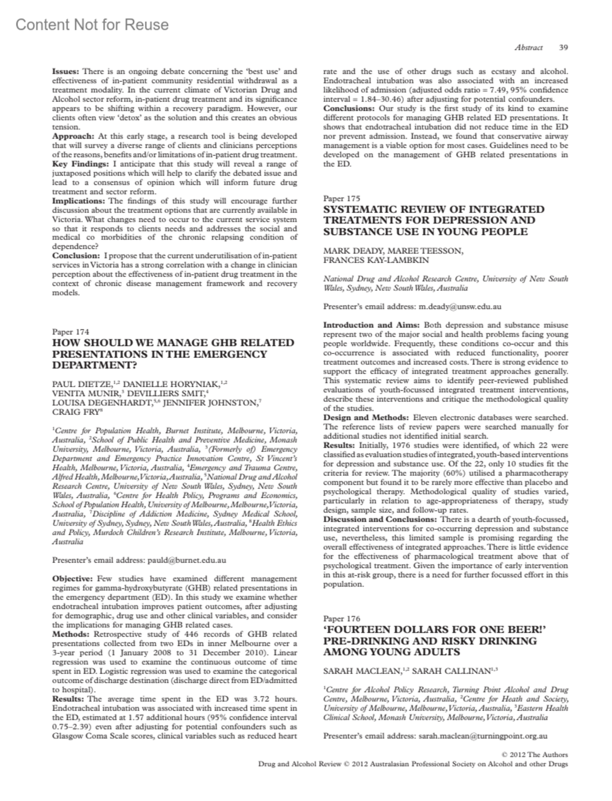 SYSTEMATIC REVIEW OF INTEGRATED TREATMENTS FOR DEPRESSION AND SUBSTANCE USE IN YOUNG PEOPLEPaper 175DEADY, MARKTEESSON, MAREEKAY-LAMBKIN, FRANCESAuthor informationNational Drug and Alcohol Research Centre, University of New South Wales, Sydney, New South Wales, AustraliaPresenter's email address: [email protected]Drug and Alcohol Review 31:p 39, November 2012.Copyright © 2012 Blackwell Publishing Ltd.
