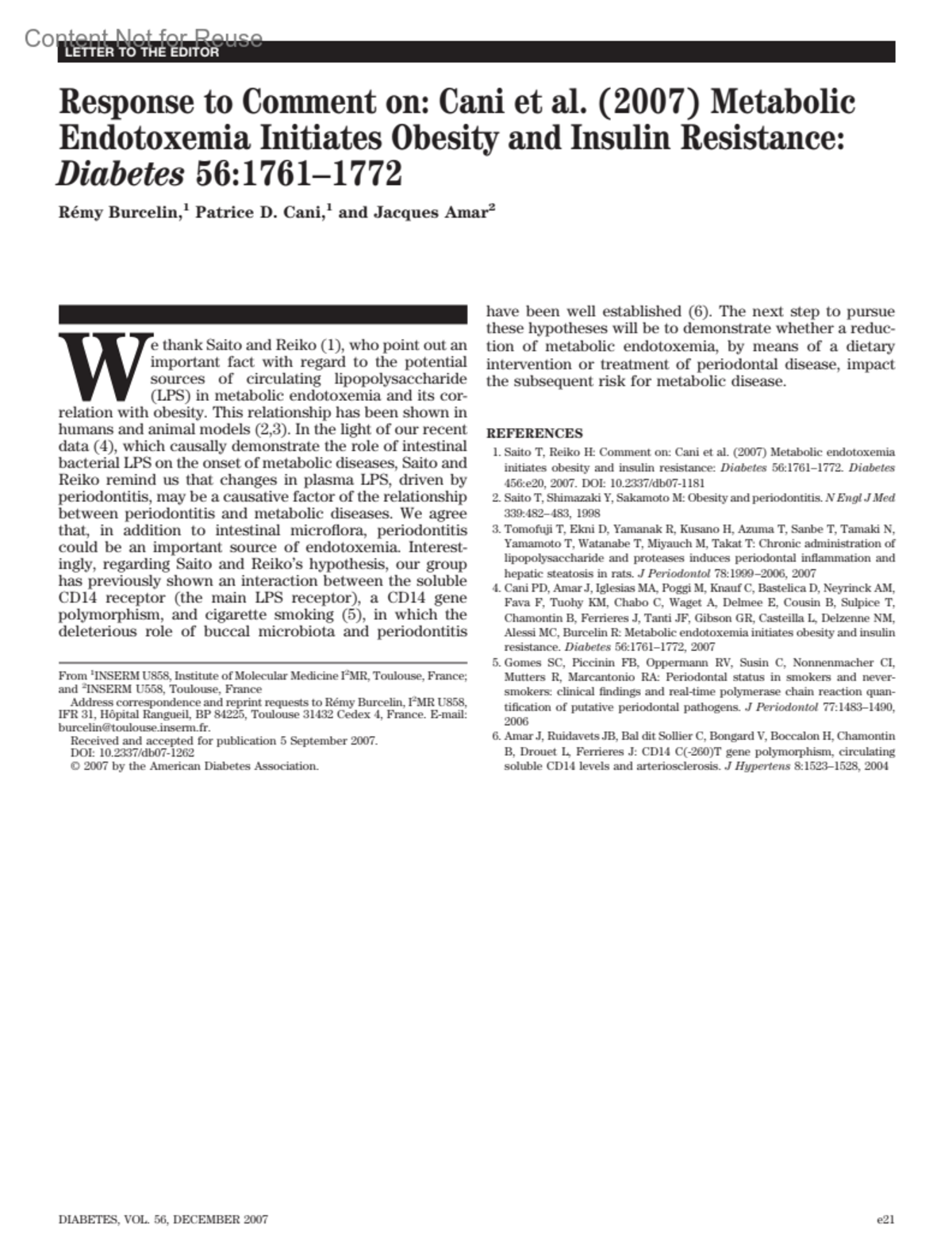 Comment on: Cani et al. (2007) Metabolic Endotoxemia Initiates Obesity and Insulin Resistance: Diabetes 56:1761–1772