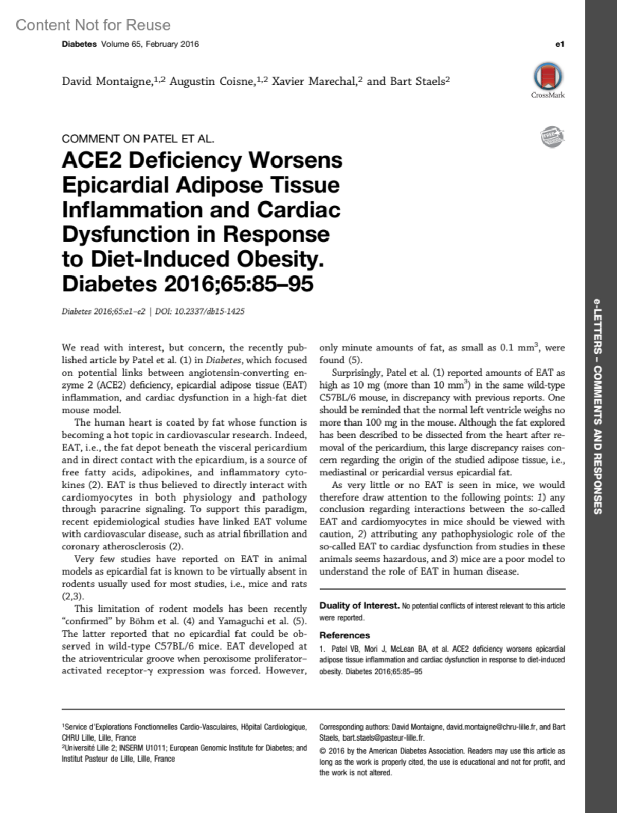 Comment on Patel et al. ACE2 Deficiency Worsens Epicardial Adipose Tissue Inflammation and Cardiac Dysfunction in Response to Diet-Induced Obesity. Diabetes 2016;65:85-95