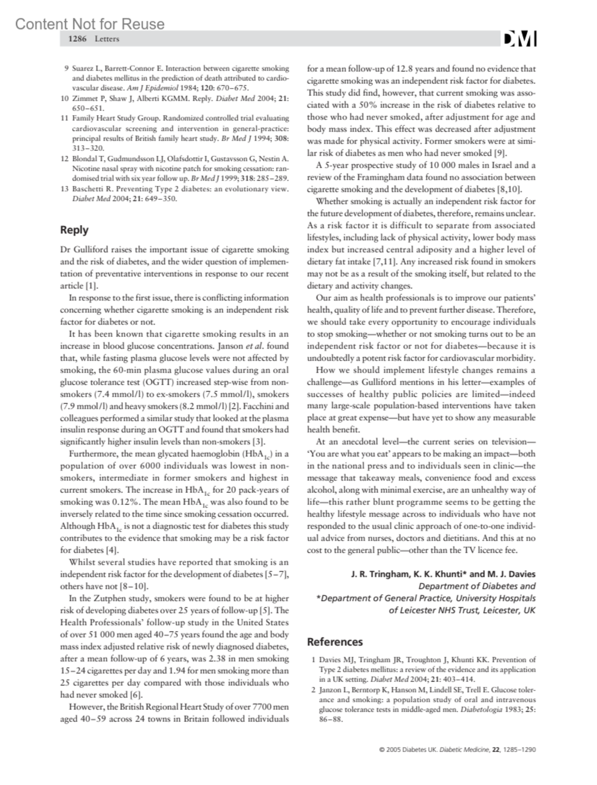 Cigarette smoking and prevention of Type 2 diabetes mellitusTringham, J. R.Khunti, K. K.Davies, M. J.Author informationDepartment of Diabetes, University Hospitals of Leicester NHS Trust, Leicester, UK (Tringham) (Davies)*Department of General Practice, University Hospitals of Leicester NHS Trust, Leicester, UKDiabetic Medicine 22(9):p 1286-1287, September 2005.Copyright © 2005 Blackwell Publishing Ltd.