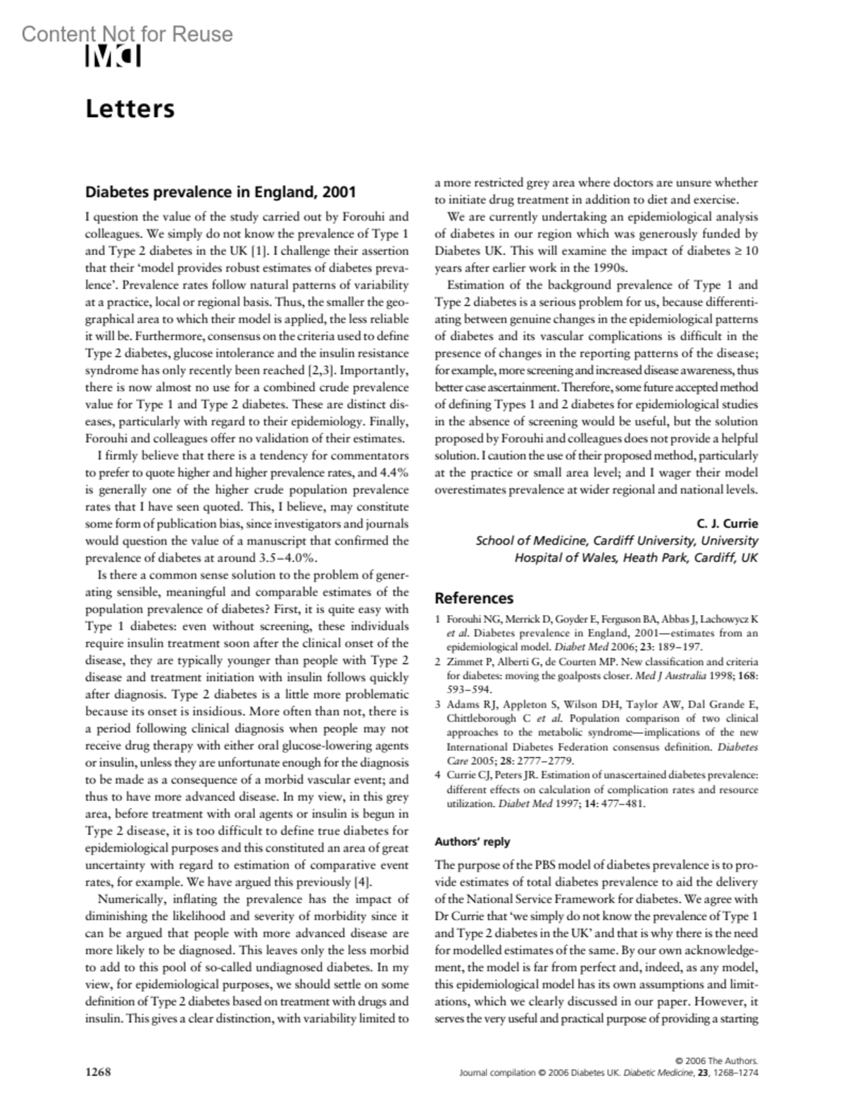 Diabetes prevalence in England, 2001Forouhi, N.Goyder, E.Merrick, D.Wild, S.Ferguson, B.Author informationMRC Epidemiology Unit, Strangeways Research Laboratory, Wort's Causeway, Cambridge, UK (Forouhi)*Yorkshire and Humber Public Health Observatory, Alcuin Research and Resource Centre, The University of York, York, UK†School of Health and Related Research (ScHARR), University of Sheffield, Sheffield, UK§Public Health Sciences, University of Edinburgh, Edinburgh, UKDiabetic Medicine 23(11):p 1268-1270, November 2006.Copyright © 2006 Blackwell Publishing Ltd.
