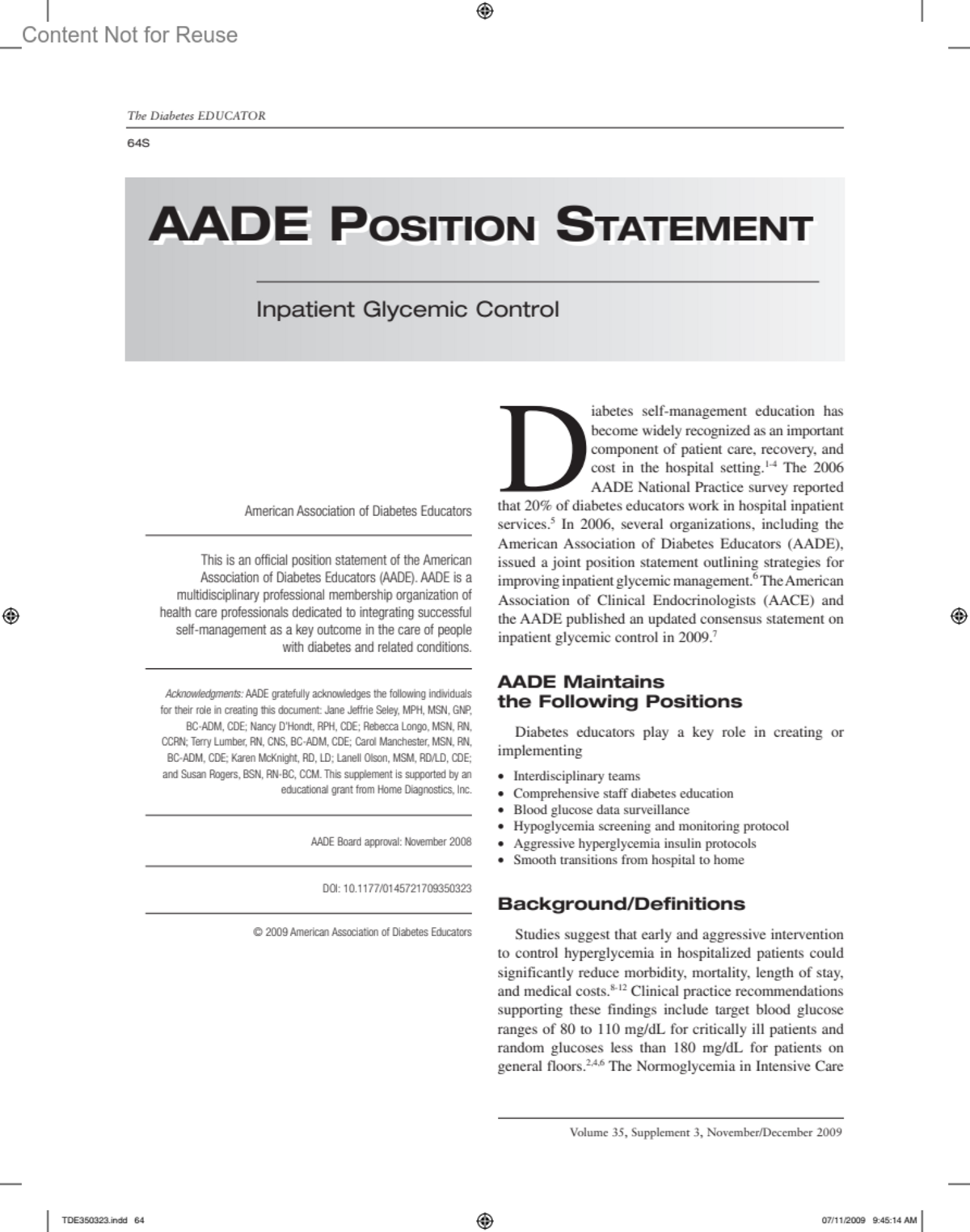 Acknowledgments: AADE gratefully acknowledges the following individuals for their role in creating this document: Jane Jeffrie Seley, MPH, MSN, GNP, BC-ADM, CDE; Nancy D'Hondt, RPH, CDE; Rebecca Longo, MSN, RN, CCRN; Terry Lumber, RN, CNS, BC-ADM, CDE; Carol Manchester, MSN, RN, BC-ADM, CDE; Karen McKnight, RD, LD; Lanell Olson, MSM, RD/LD, CDE; and Susan Rogers, BSN, RN-BC, CCM. This supplement is supported by an educational grant from Home Diagnostics, Inc.