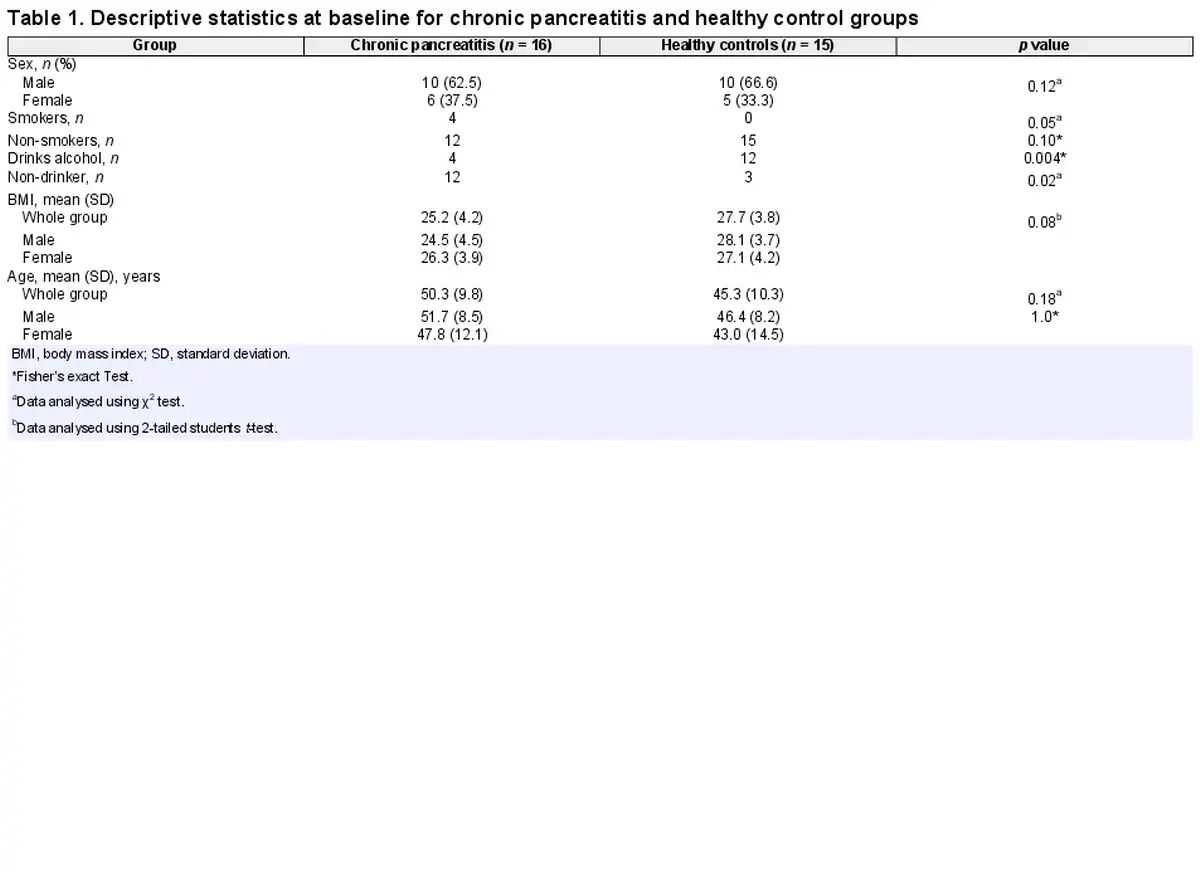 Controls were eligible for inclusion if they did not have a history of pancreatic disease including pancreatitis, a history of pancreatic cancer, total pancreatectomy, or cystic fibrosis. They were excluded if they were pregnant or breastfeeding, had a prognosis of <6 months, had another malabsorptive disorder including coeliac disease or IBD, were on artificial nutrition support, were current inpatients, were not independently mobile, had a recent non-controlled cardiac event, or were those who declined or were unable to provide informed consent.