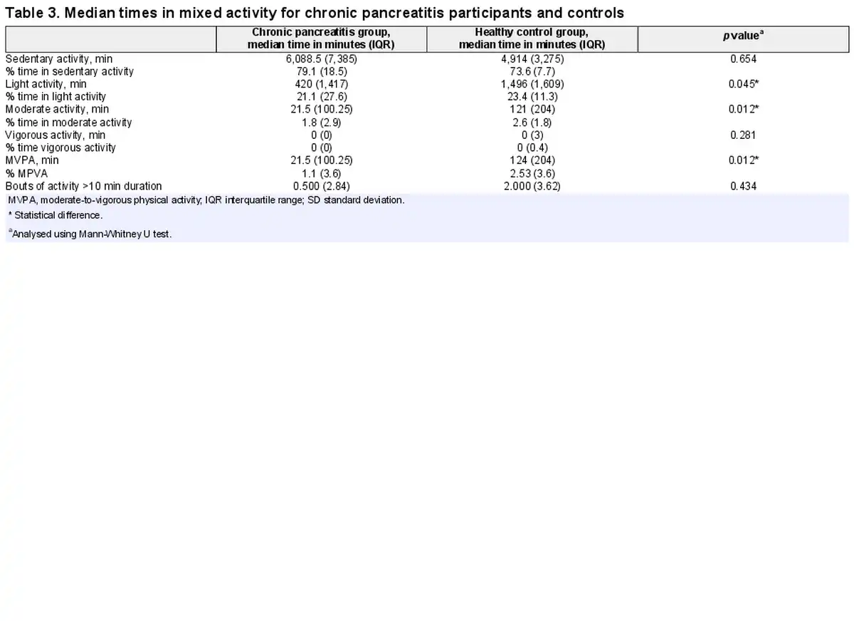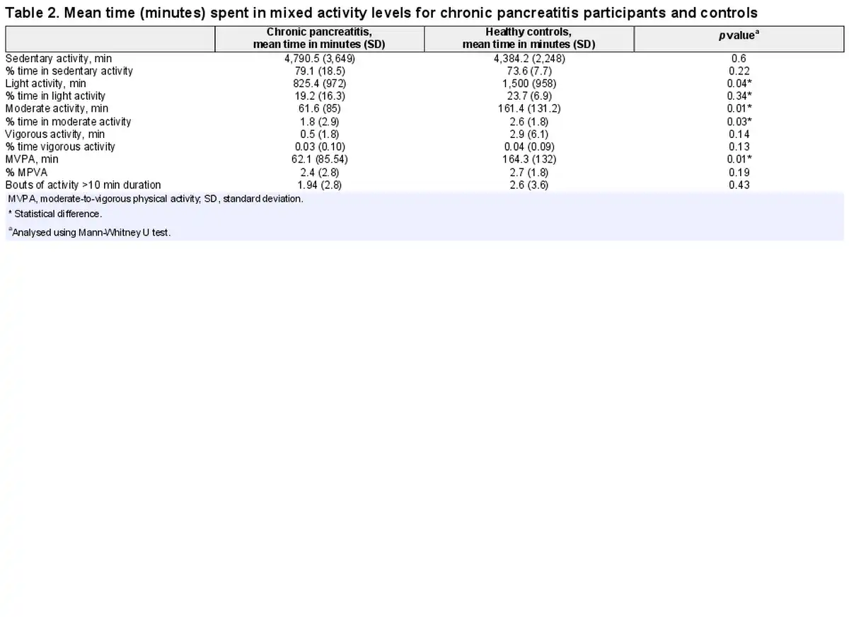 Participants with chronic pancreatitis spent a significantly lower amount of time in light, moderate, and moderate-vigorous activity than those in the control group. There was no significant difference when activity was assessed in bouts of 10-min activity. There was no significant difference between the groups for vigorous or sedentary activity (see Tables 2 and 3).