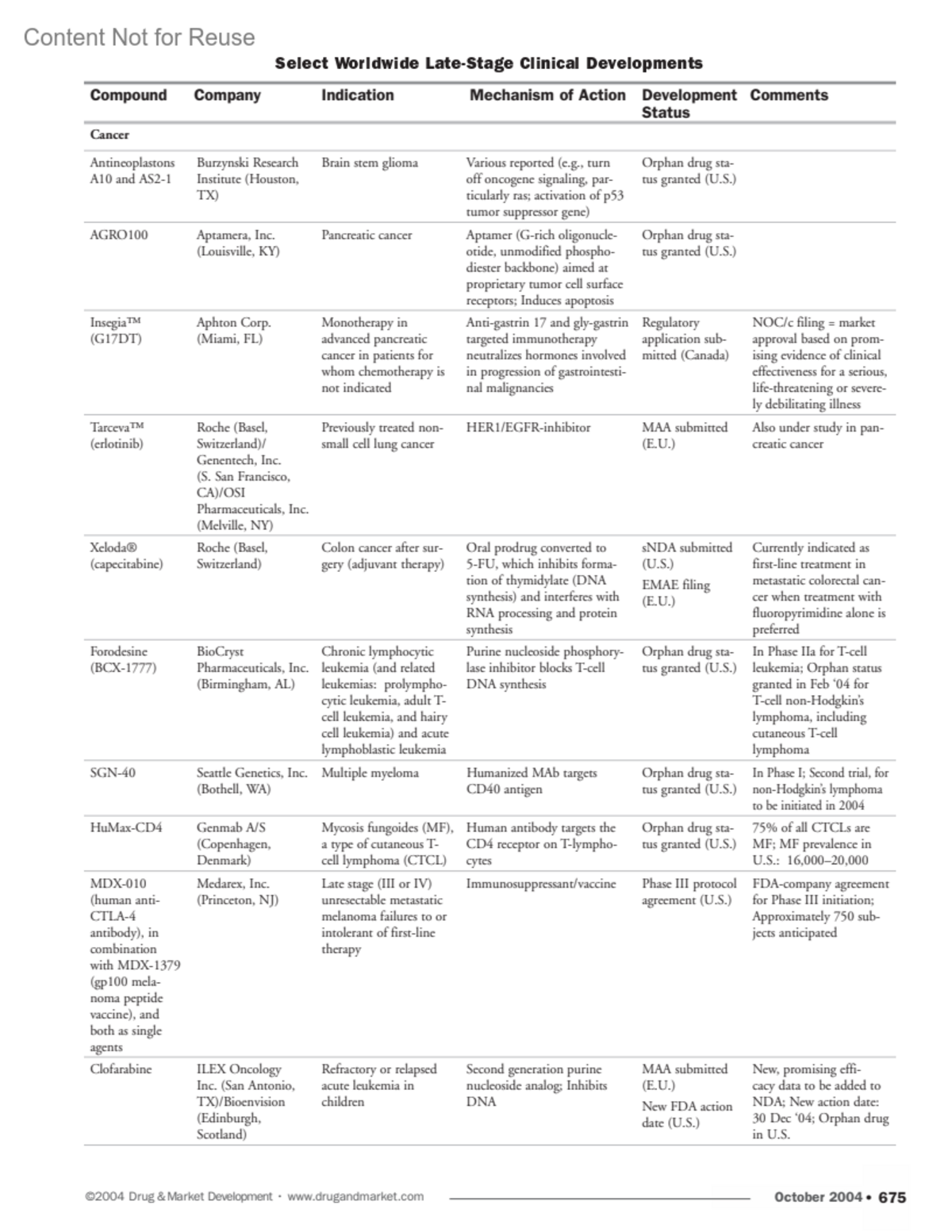 Select Worldwide Late-Stage Clinical DevelopmentsDrug & Market Development 15(10):p 675-680, October 2004.Copyright © 2004 Drug & Market Development