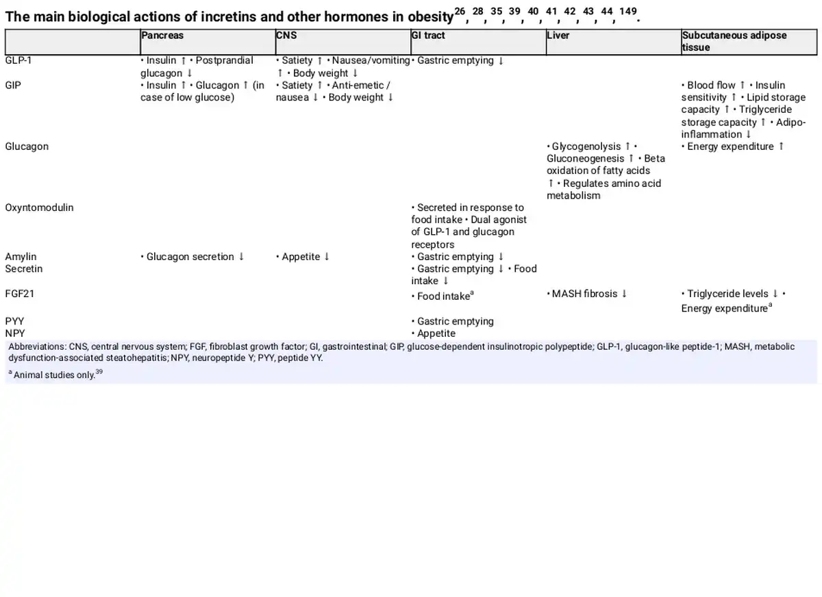 Glucagon is a pancreatic peptide hormone whose receptors are mostly expressed in the liver where it exerts a hyperglycaemic effect by increasing glycogenolysis and gluconeogenesis (Table 1). Glucagon also regulates amino acid metabolism, stimulates beta oxidation of fatty acids and increases energy expenditure., Under discussion remains its ability to generate a satiety signal and reduce food intake, as suggested by studies in animals. Increased glucagon secretion has been observed in obesity, T2D and MASH. Glucagon has a peptide sequence related to that of GLP‐1 and GIP, making it possible to create agonists for more than one receptor, such as GLP‐1/GIP, GLP‐1/glucagon or GLP‐1/GIP/glucagon.