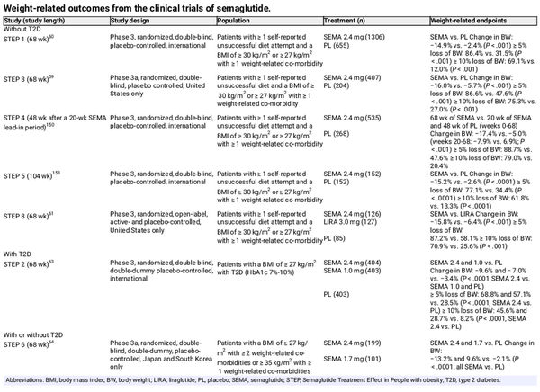 - 78. Knop FK, Aroda VR, do Vale RD, et al. Oral semaglutide 50 mg taken once per day in adults with overweight or obesity (OASIS 1): a randomised, double‐blind, placebo‐controlled, phase 3 trial. Lancet. 2023;402(10403):705–719.