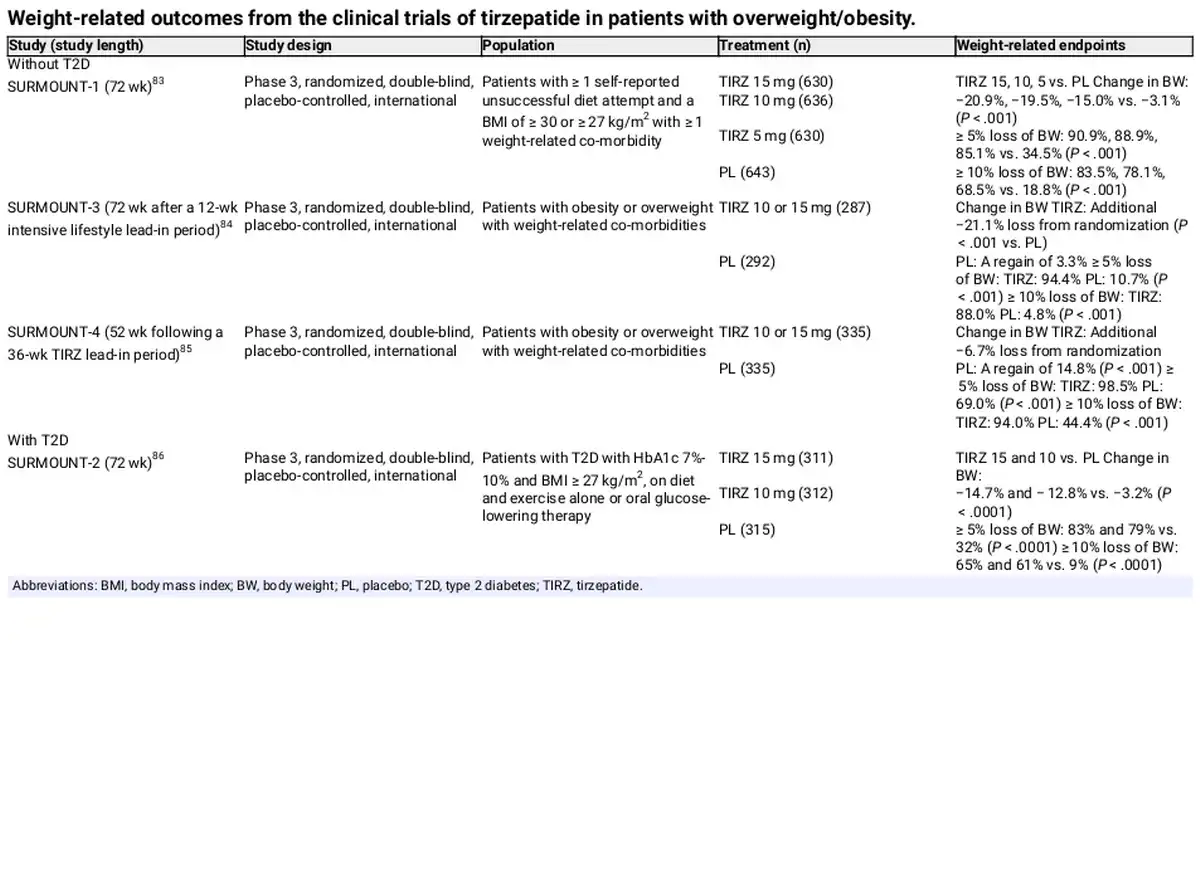 - 84. Wadden TA, Chao AM, Machineni S, et al. Tirzepatide after intensive lifestyle intervention in adults with overweight or obesity: the SURMOUNT‐3 phase 3 trial. Nat Med. 2023;29(11):2909–2918.